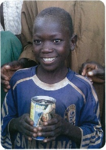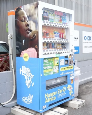 この自販機の売上の一部(1本あたり10円)は、飢餓と貧困に苦しむアフリカの人々を助ける「ハンガーゼロ・アフリカ」の働きに用いられます。例えば、ドリンク3本の寄付金30円はアフリカの人々の1食分となります。