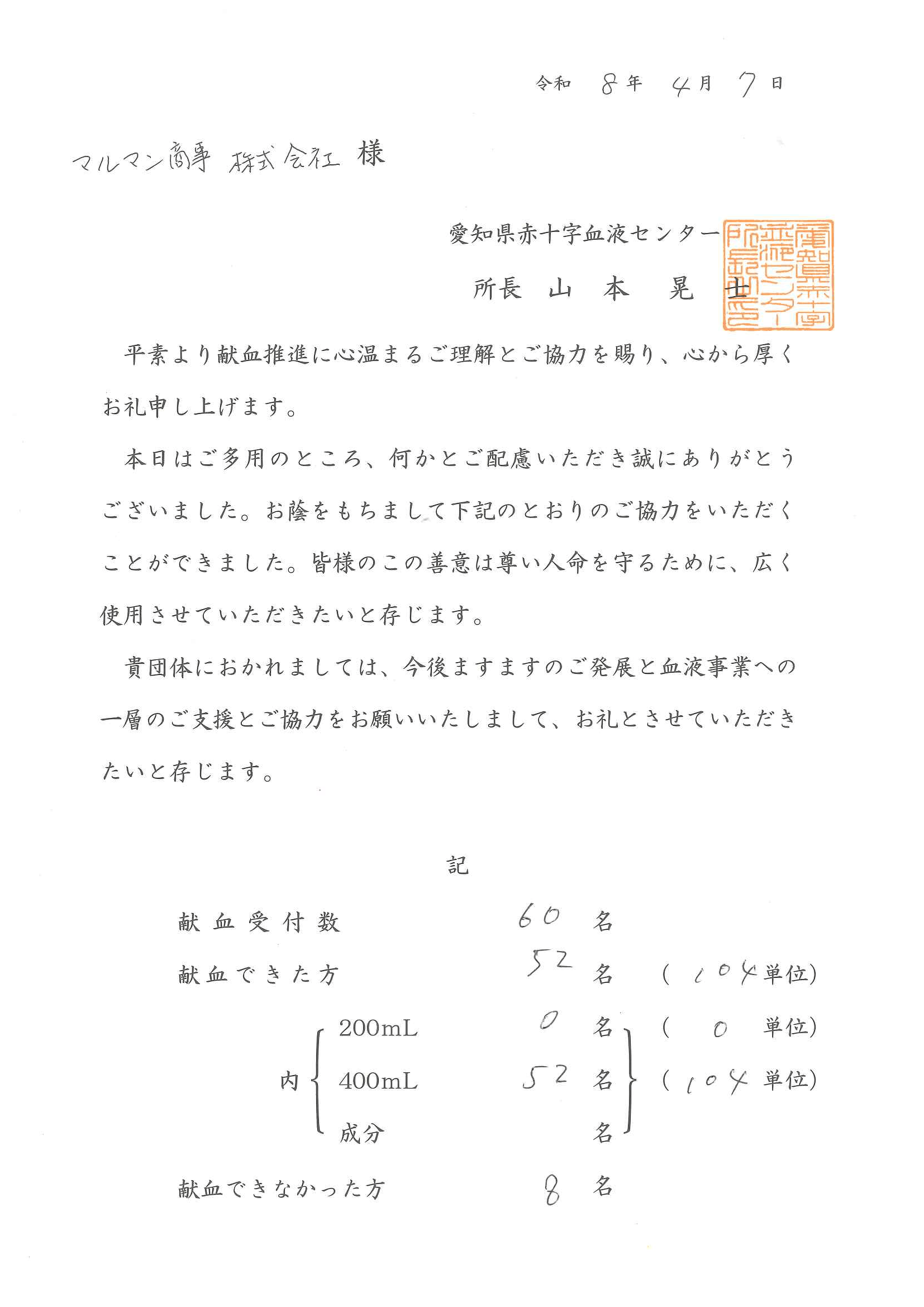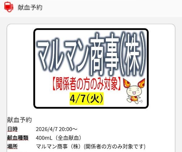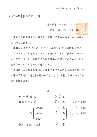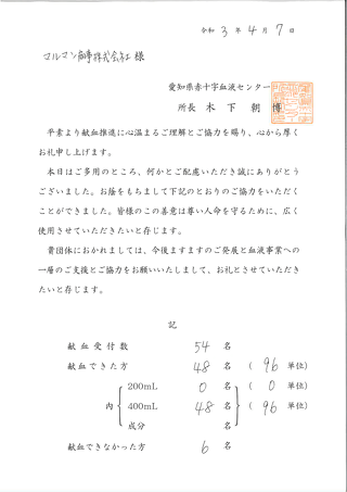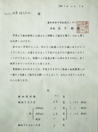 取引先各位、ご参加いただきました皆様には、献血へのご協力・お時間を頂戴しまして、心より深く御礼申し上げます。ありがとうございました。