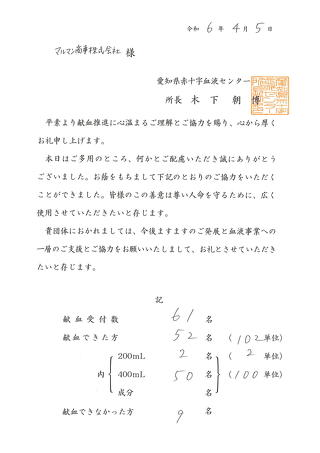 取引先各位、ご参加いただきました皆様には、献血へのご協力・お時間を頂戴しまして、心より深く御礼申し上げます。有難うございました。
